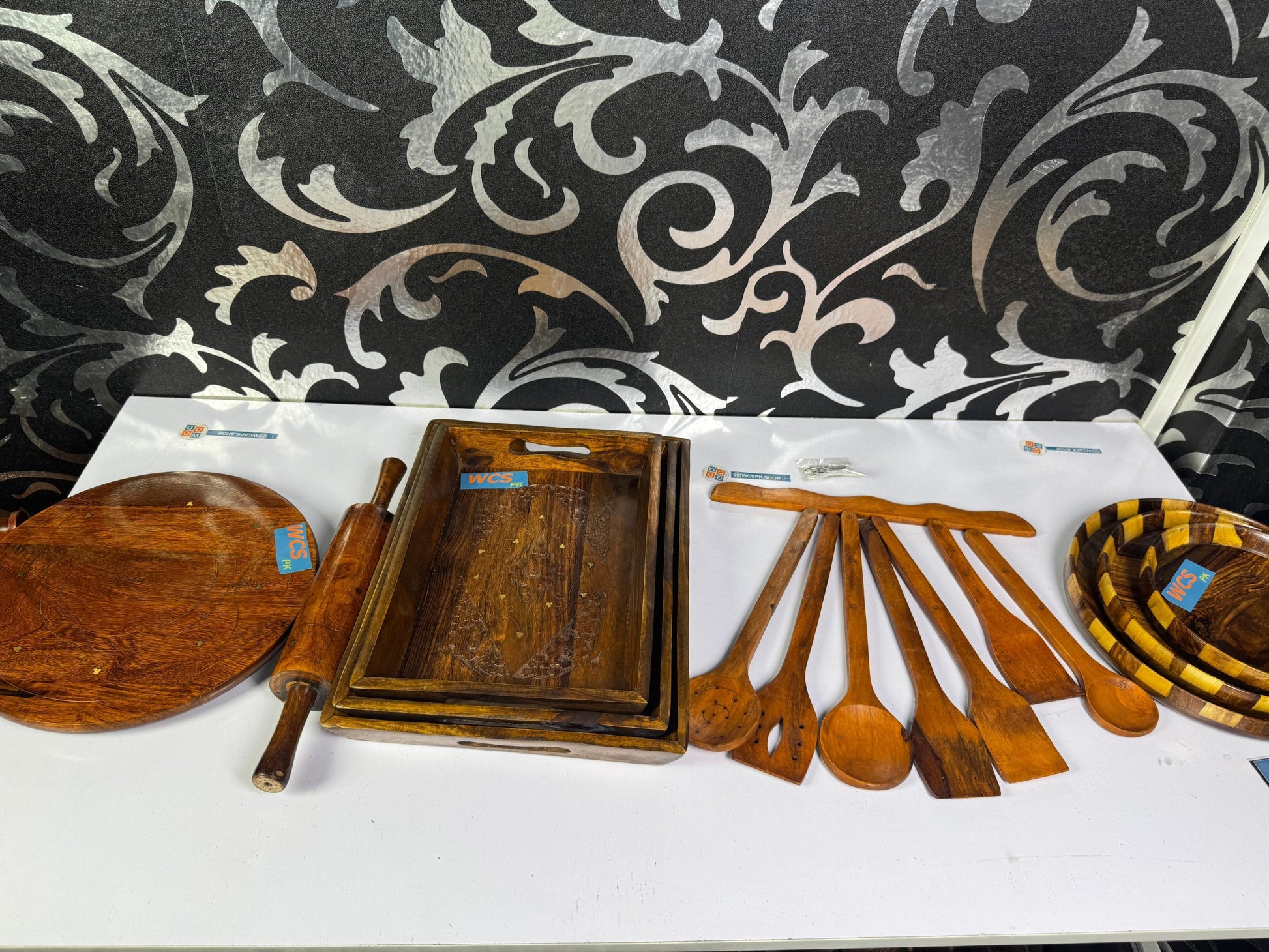 Upgrade your kitchen with this set featuring a beautifully crafted Tray Set, a stylish chkla bailn, durable Cooking Spoons, and a functional plate set.