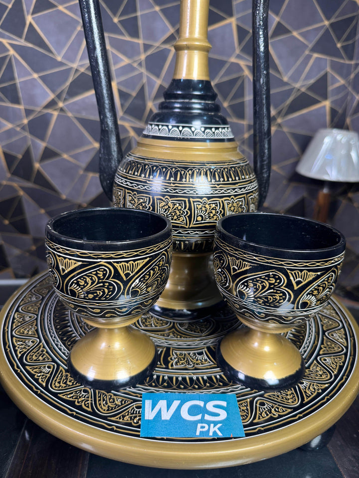 Elevate your table décor with this exquisite Surahi Set, adorned with intricate Naqshi (engraving) craftsmanship. Carefully handmade by skilled artisans, this set brings together tradition, elegance, and functionality.