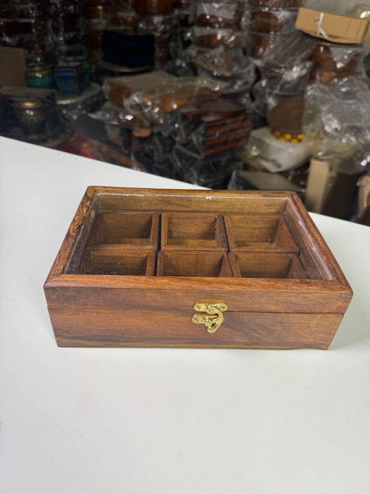Handcrafted Wooden Spice Box with multiple compartments, perfect for organizing your spices while adding a rustic charm to your kitchen.